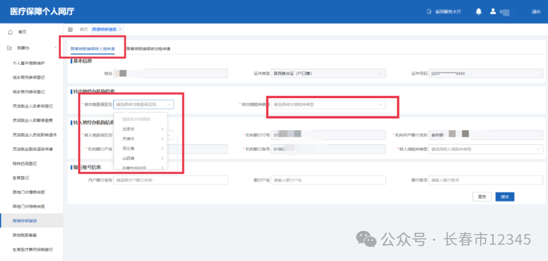 6、进入后,外地医保转长春市,选择“跨省转移接续转入地申请”,转出地经办机构信息按原参保地要求选择,转出地险种类型:职工基本医疗保险。