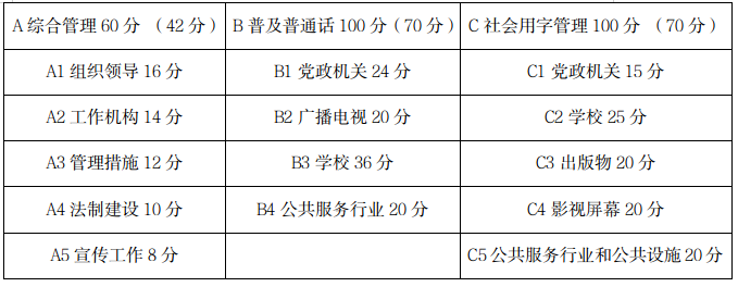 《一类城市语言文字工作评估标准》(试行)由综合管理、普及普通话、社会用字管理三部分组成,总分260分,每项不得少于总分的70%。如下表: